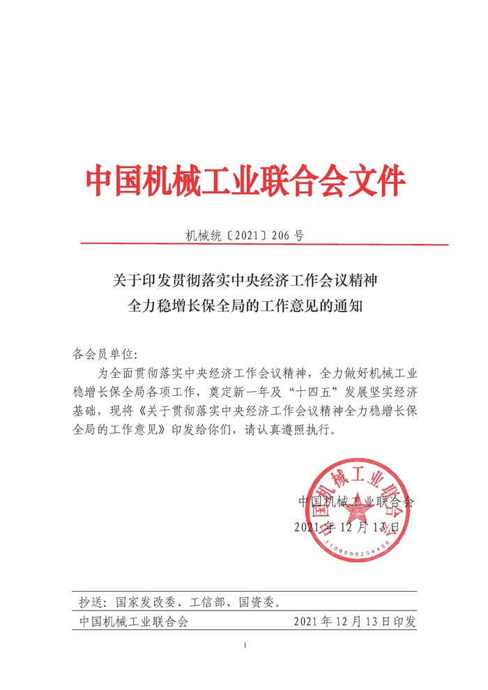 中国机械联印发《关于贯彻落实中央经济工作会议精神全力稳增长保全局的工作意见》