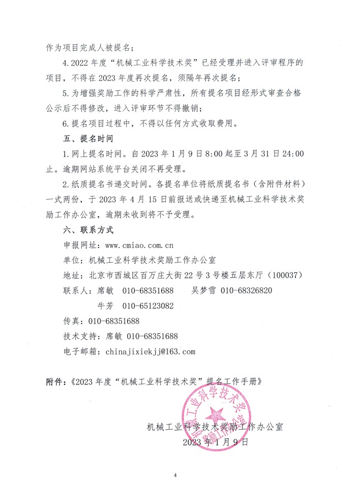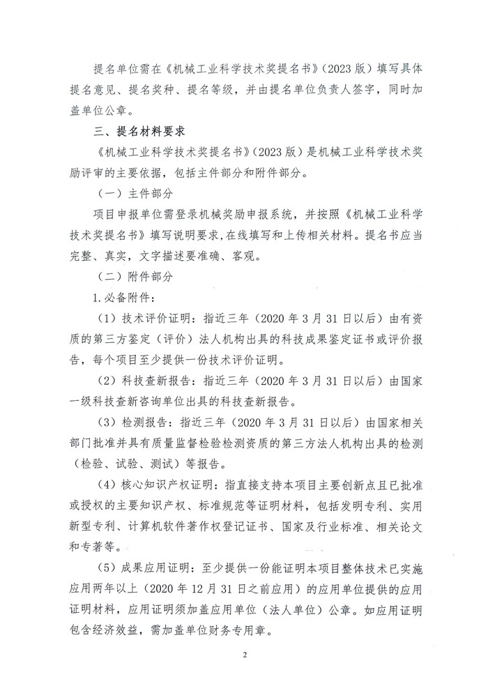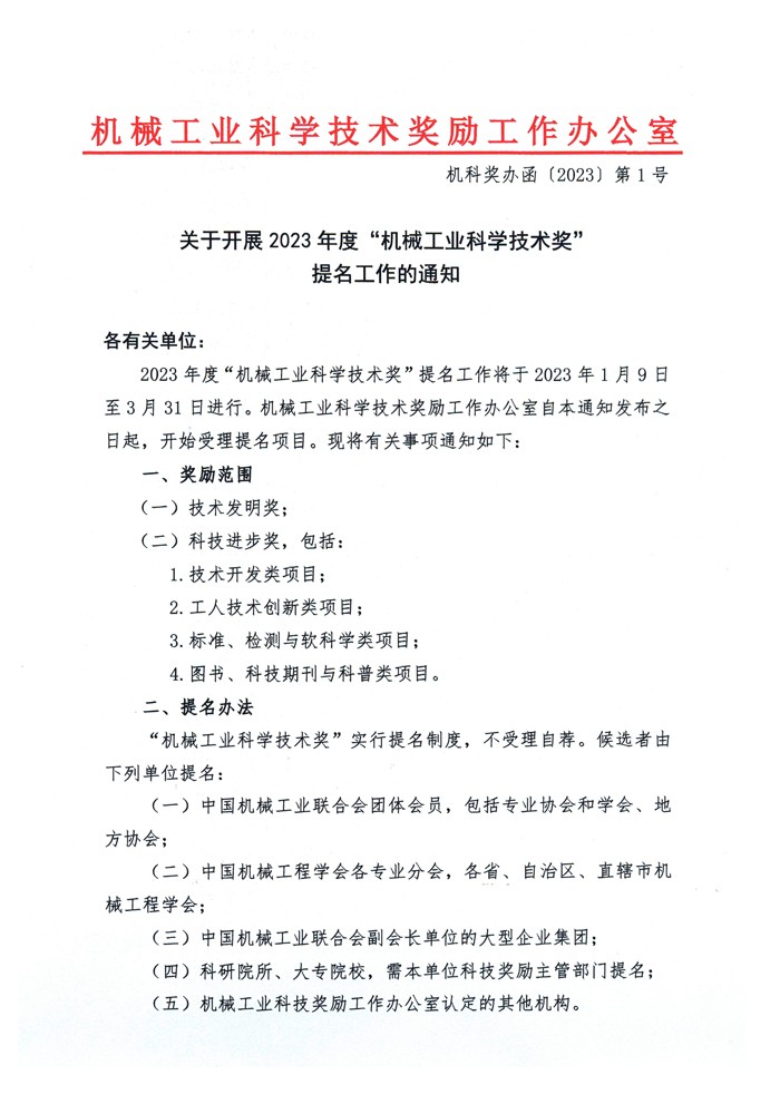 近日,机械工业科学技术奖奖励工作办公室对外发布“关于开展2023年度‘机械工业科学技术奖’提名工作的通知”,并开始受理提名项目。受理时限为:2023年1月9日至3月31日。