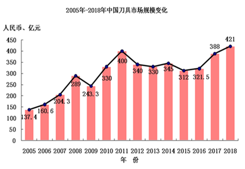 根据luck18网址工具分会的统计、调查及分析,对我国刀具市场消费总规模、进出口进行了测算。我国刀具市场总消费规模从2017年的388亿元人民币增加到2018年的421亿元,同比增长8.5%。其中:国产刀具约273亿元人民币,与2017年相比增幅为9.6%,占比65%;进口刀具(境外品牌)148亿元人民币,同比增长6.5%,占比35%。2018年的刀具消费额超过2011年400亿的高点,创历史最高记录。国产刀具在中国市场的增长高于进口刀具。