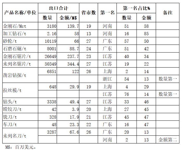 表1给出了超硬材料各类商品出口省市数量及金额的第一名。作为单一商品最多有27个省市在经营出口业务,但出口额排第一名的省市非常集中,主要有河南、广东、江苏、上海四个省市。四个省市排名第一的产品分别是:河南,金刚石与加工金刚石;广东,砂轮、石磨石碾、车刀、未列名刀具;江苏,金刚石锯片、未列名锯片、钻头、铣刀;上海,凿岩钻探工具和镗铰刀。