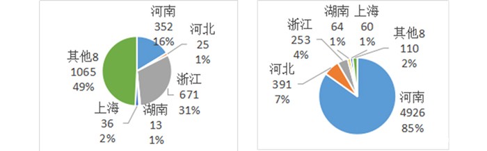 图2是2019年加工金刚石出口省市分布。由图2可知,计有13个省市经营该业务。出口总量2163 kg,总额5804万美元。前5名占出口量的51%,占出口额的98%;其他8个省市分别占49%、2%;浙江出口量最大,占31%;河南出口额最大,占85%。平均出口单价是26.8 $/g;最高的是河北,156.6 $/g,最低的是浙江3.8 $/g,最高最低单价差41倍多,具体产品可能不同。