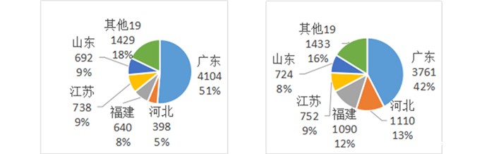 图4是2019年金刚石石磨、石碾出口省市分布。由图4可知,计有24个省市经营该业务。出口总量8001吨,总额8869万美元。前5名占出口量的82%,占出口额的84%;其他19个省市分别占18%、16%;广东一省独大,占总量的51%,占总额的42%。平均出口单价是11.1 $/kg;最高的是河北,27.9 $/kg;最低的是广东9.2 $/kg;最高最低单价差3倍多,具体产品结构差异较大。