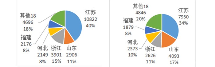 图5是2019年金刚石锯片出口省市分布。由图5可知,计有23个省市经营该业务。出口总量26649吨,总额23767万美元。前5名占出口量的82%,占出口额的80%;其他18个省市分别占18%、20%;江苏省最大,占总量的40%,占总额的34%。平均出口单价是8.9 $/kg;最高的是山东,14.1$/kg;最低的是浙江6.7 $/kg;最高最低单价差2倍多,具体产品结构有差异。