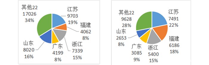 图6是2019年未列名锯片出口省市分布。由图6可知,计有27个省市经营该业务。出口总量50349吨,总额34444万美元。前5名占出口量的66%,占出口额的72%;其他22个省市分别占34%、28%;江苏省排首位,占总量的19%,占总额的22%。平均出口单价是6.8 $/kg;最高的是福建,15.2 $/kg;最低的是山东3.3 $/kg;最高最低单价差近5倍,具体产品结构差异较大。