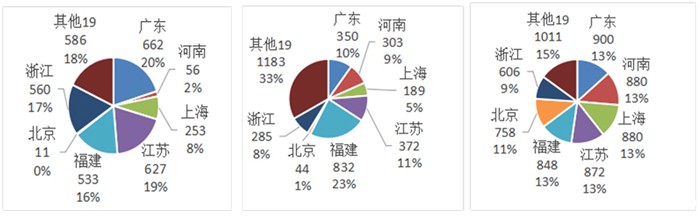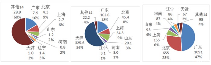 a.数量分布(单位:吨) b.数量分布(单位:万件) c.金额分布(单位:万美元)