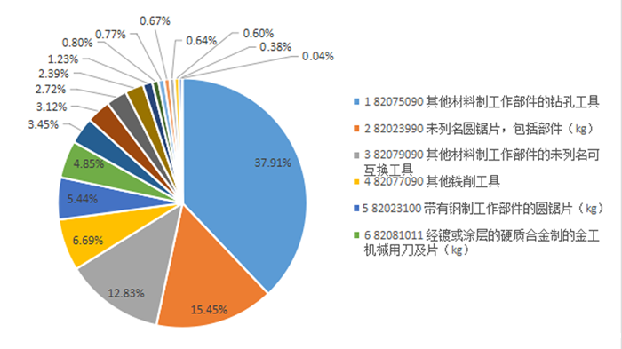 1-9月,刀具出口主要品种:钻头(61.54亿元)、圆锯片(33.92亿元)、互换工具(20.83亿元)、刀片(13.28亿元)、铣刀(10.86亿元)、攻丝工具(5.59亿元)、超硬孔加工刀具(5.07亿元)、超硬互换工具(3.88亿元)、带锯条(2亿元)。