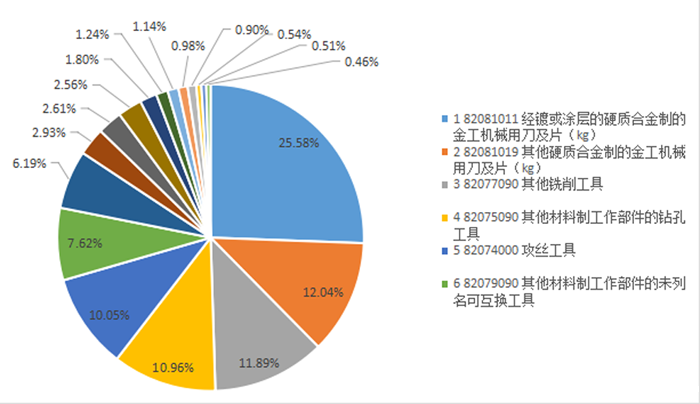 1-9月,刀具进口主要品种:刀片(35.23亿元)、铣刀(9.56亿元)、钻头(8.82亿元)、攻丝工具(8.08亿元)、互换工具(6.13亿元)、超硬互换工具(2.36亿元)、镗铰刀(2.06亿元)、带锯条(0.92亿元)。