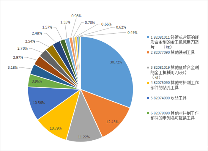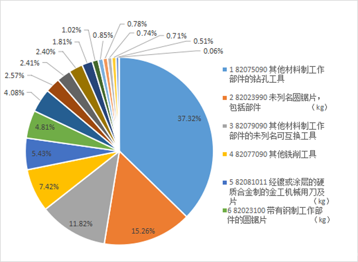 钻头(65.25亿元),圆锯片(35.08亿元),互换工具(20.66亿元),刀片(15.25亿元),铣刀(12.98亿元),攻丝工具(7.13亿元),超硬互换工具(4.21亿元),超硬孔加工刀具(4.2亿元),带锯条(3.17亿元)。