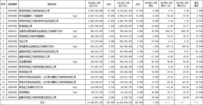 2022年1-9月刀具出口占比及增长见下表。
