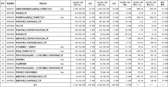 2022年1-9月刀具进口占比及增长见下表。