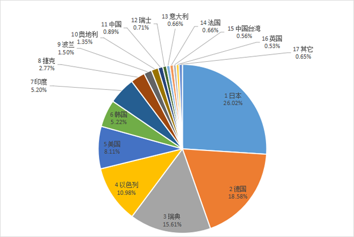 涂层刀片进口来源地主要为:日本26.02%;德国18.58%;瑞典15.61%;以色列10.98%;美国8.11%;韩国5.22%;印度5.2%。