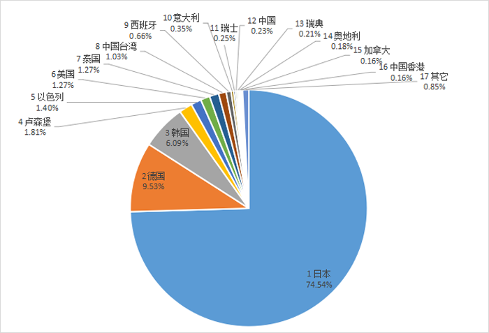 非涂层刀片进口来源地主要为:日本74.54%;德国9.53%;韩国6.09%;卢森堡1.81%;以色列1.4%;美国1.27%;泰国1.27%。