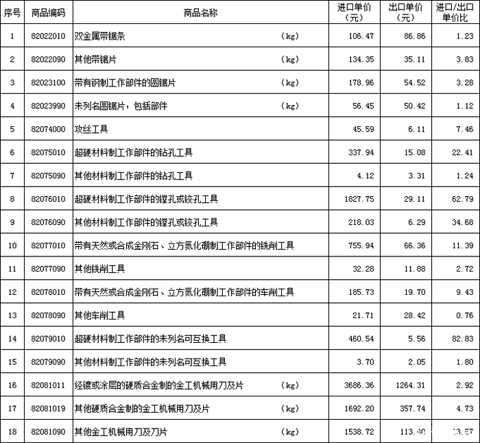附表中,在计算产品单价时,圆锯片、刀片、带锯条的单位采用公斤(kg),其它类产品以件为单位。