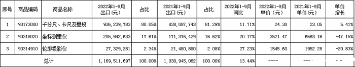 2022年1-9月量具、量仪出口占比及增长见下表。