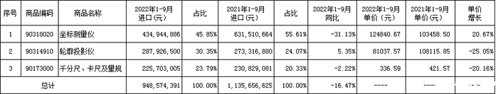2022年1-9月量具和量仪进口额9.49亿元,同比下降16.47%。其中,量具进口2.26亿元,同比下降2.22%,量仪(坐标测量仪、轮廓投影仪)进口7.23亿元,同比下降20.11%。
