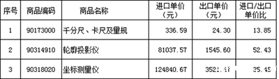 比较相同商品编码产品,进口量具和量仪价格远高于出口价格见下表。