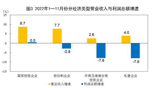 1—11月份,规模以上工业企业中,国有控股企业实现利润总额24049.7亿元,同比增长0.5%;股份制企业实现利润总额56412.0亿元,下降2.8%;外商及港澳台商投资企业实现利润总额18378.5亿元,下降7.8%;私营企业实现利润总额22636.9亿元,下降7.9%。