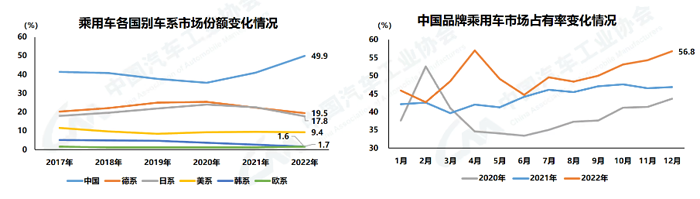 值得关注的是,近年来,中国品牌车企紧抓新能源、智能网联转型机遇,推动汽车电动化、智能化升级和产品结构优化,得到广大消费者青睐。同时,企业国际化的发展更不断提升品牌影响力。2022年以来,中国品牌乘用车市场占有率一路攀升。2022年中国品牌乘用车销量1176.6万辆,同比增长22.8%。市场份额达到49.9%,上升5.4个百分点。