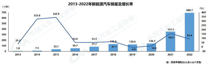 2022年,新能源汽车产销分别达到705.8万辆和688.7万辆,同比增长96.9%和93.4%,市场占有率达到25.6%。