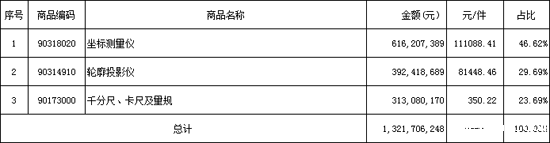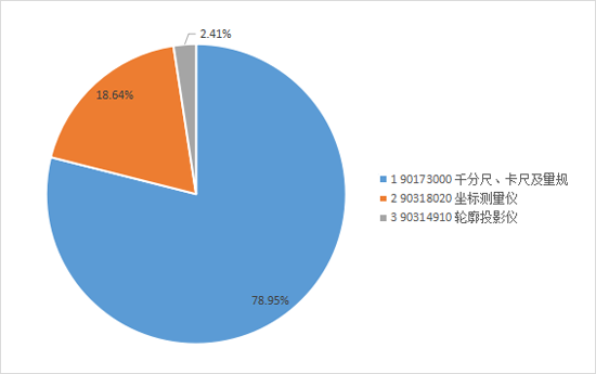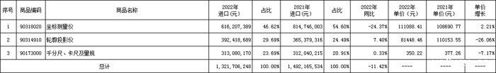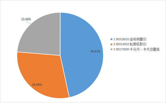 2022年量具和量仪进口额(见表3和表4)13.22亿元,同比去年下降11.42%。其中,量具进口3.13亿元,同比去年增长0.33%,量仪(坐标测量仪,轮廓投影仪)进口10.09亿元,同比去年下降14.53%。2022年量具,量仪进口分类如图2所示。