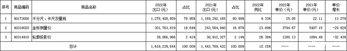 2022年量具和量仪出口额(见表1和表2)16.19亿元,同比去年增长12.15%。其中,量具(千分尺,卡尺及量规)出口额12.78亿元,同比去年增长9.33%;量仪(坐标测量仪,轮廓投影仪)出口额3.41亿元,同比去年增长24.17%。2022年量具,量仪出口分类如图1所示。