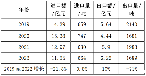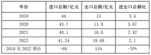 表1 2019-2022年硬质合金刀片进出口总额(来源:海关)