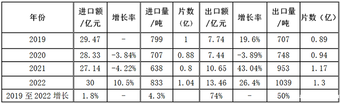表3 2019-2022年非涂层刀片进出口情况(来源:海关)