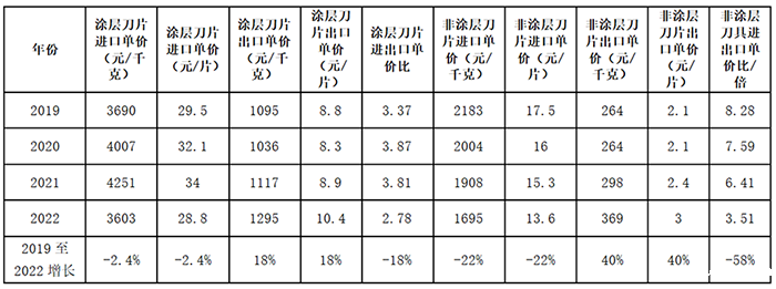 表4 2019-2022年硬质合金刀片进出价格比较(来源:海关,按一片8克估算每片单价)