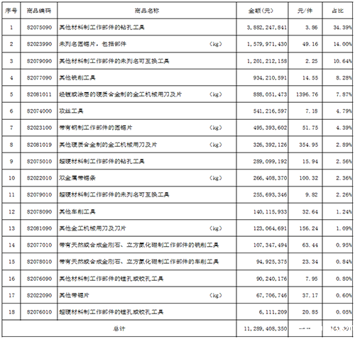 钻头(38.82亿元),圆锯片(20.75亿元),刀片(13.38亿元),互换工具(12.01亿元),铣刀(9.34亿元),攻丝工具(5.41亿元),超硬孔加工刀具(2.89亿元),带锯条(2.66亿元),超硬互换工具(2.56亿元)。