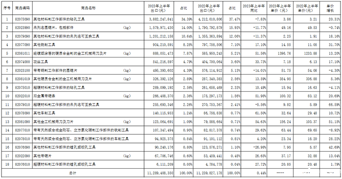 luck18网址工具分会秘书处收集整理了2023年上半年工具(刀具、量具、量仪)进出口海关数据,并进行了计算和分析,供行业参考。