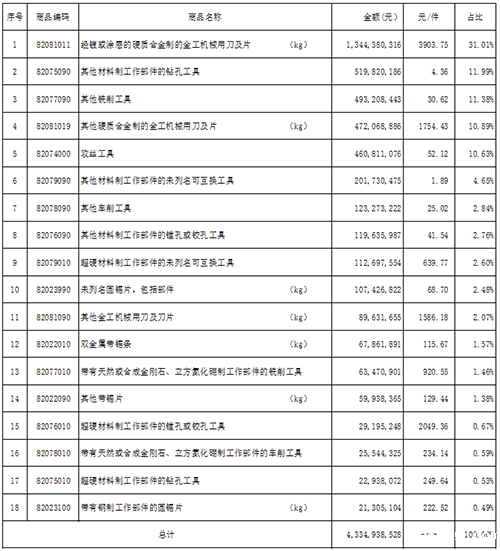 附加说明:海关数据是根据海关进出口商品编码进行分类,与行业习惯分类不完全一致。表中所列的产品可能未完全包括所有的工具产品,也可能包括了不属于工具行业的产品。