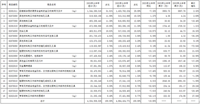 (3)2023年上半年刀具进口主要品种及金额