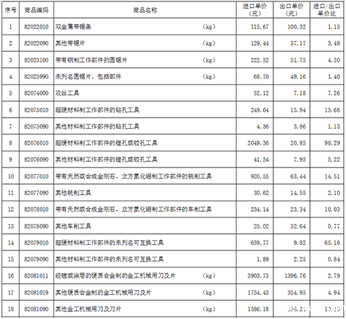 比较相同商品编码产品,进口刀具价格远高于出口价格。例如:涂层刀片的进口平均价格约为出口平均价格的2.79倍,未涂层刀片为4.94倍,攻丝工具为7.26倍,铣刀为2.1倍。进出口单价差较以往有所缩小。