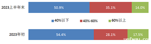 从分布情况看,资产负债率在40%以下的占50.9%,比年初下降3.5个百分点;介于40%-60%之间的占35.1%,比年初上升7.0个百分点;高于60%的占14.0%,比年初下降3.5个百分点。超过70%的,有四家,年初有三家;上半年末和年初均无超过100%的情况。整体呈现出往中间聚集的走势。资产负债率的整体分布情况见图1。