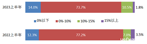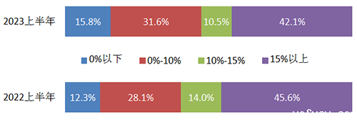从利润率的分布看,2023年上半年利润率在0%以下的占15.8%,占比上升3.5个百分点;位于0%-10%之间的占31.6%,占比上升3.5个百分点;位于10%-15%之间的占10.5%,占比下降3.5个百分点;位于15%以上的占42.1%,占比下降3.5个百分点。整体分布明显往左侧集中。利润率的整体分布情况见图2。