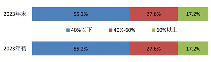 2023年,行业上市公司的利润率(利润率=利润总额/营业收入)为7.6%,同比下降0.3个百分点。其中,20家同比增长,占34.5%;38家同比下降,占65.5%。