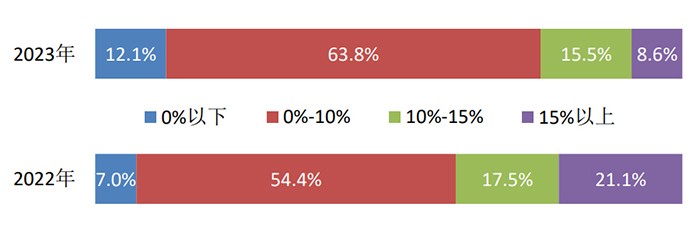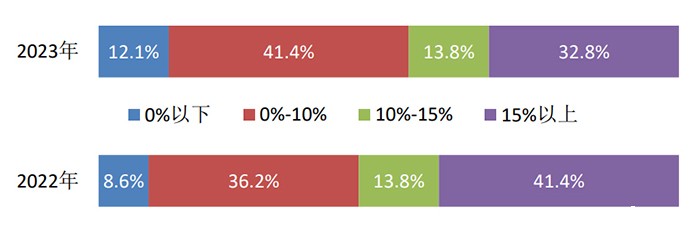 利润率分布情况见图2。与上年相比,利润率在0%以下企业数占比上升3.4个百分点; 0%-10%占比上升5.2个百分点; 10%-15%占比与上年同期持平; 15%以上占比下降8.6个百分点。