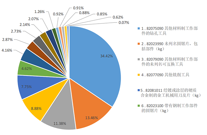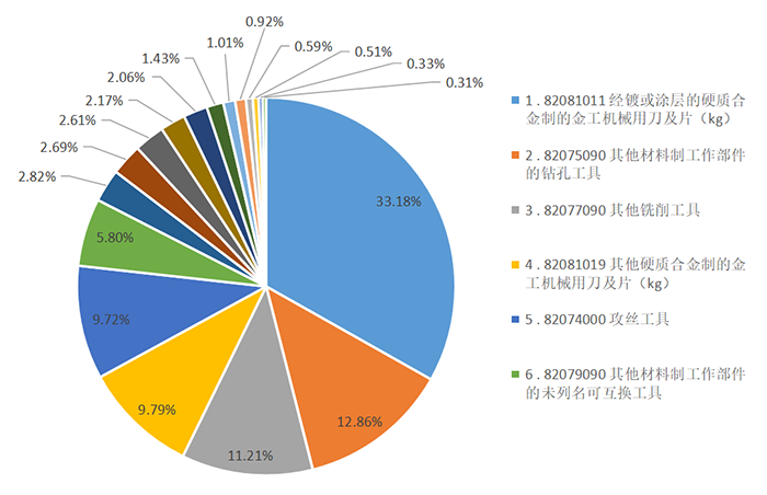海关数据是根据海关进出口商品编码进行分类,与行业习惯分类不完全一致。所列的产品可能未完全包括所有的工具产品,也可能包括了不属于工具行业的产品。在计算产品单价时,圆锯片、刀片、带锯条的单位采用公斤(kg),其它类产品以件为单位。