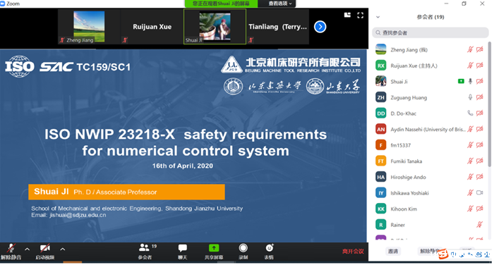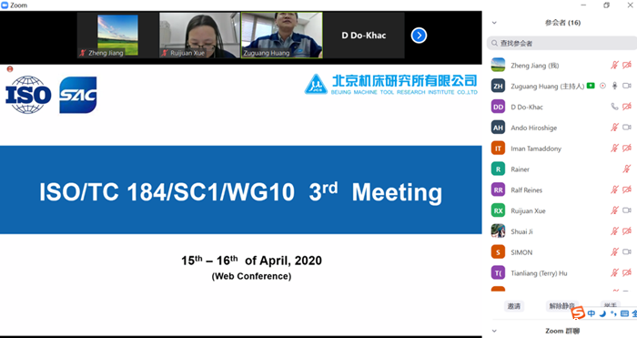 2020年4月15-16日,ISO/TC184/SC1/WG10(机床数控系统)第三次工作组会议以网络会议形式成功召开。本次会议由全国自动化系统与集成标委会物理设备控制分会(ISO/TC184/SC1国内技术对口单位)秘书处挂靠单位北京机床研究所有限公司、国家机床质量监督检验中心(简称“检测中心”)主办。来自中国、德国、意大利、英国、日本、韩国等国家的21位专家参会。