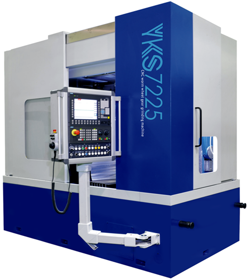 YKS7225数控蜗杆砂轮磨齿机采用立式布局、双工件主轴结构和双主轴直接驱动技术、滚轮压力角自动调整技术、多头蜗杆砂轮磨削及修整技术、齿面扭曲控制磨削技术、齿槽自动对中和余量自动分配技术;配置SIEMENS 840Dsl数控系统,可实现从工件装夹、对刀、磨削及砂轮修整的全自动控制;可配置自动上下料系统,提高机床加工效率。