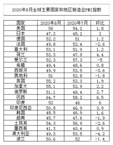 2020年8月份,欧洲制造业PMI较7月上升0.4个百分点至52%,且高于去年同期水平。从主要国家看,德国、英国和意大利等国制造业PMI呈现连续上升走势,均保持在50%以上。数据变化表明,伴随着疫情影响逐步减弱,欧洲经济呈现持续恢复趋势。但这种恢复趋势仍是建立在前期较低基础上,欧洲经济尚未恢复至疫情爆发前的水平。据西班牙《经济学家报》预测,欧洲大国的GDP要等到2021年春季才会普遍恢复增长。疫情反复以及积蓄已久的主权债务问题是困扰欧洲复苏的主要因素。为了推进欧洲经济复苏,各国继续延长刺激政策期限或者酝酿新的刺激计划。法国将推出规模达千亿欧元的经济刺激计划,将包括大幅削减企业税收、支持文化产业、创造更多就业机会等。德国政府正在讨论延长并扩大疫情期间通过的经济刺激计划。