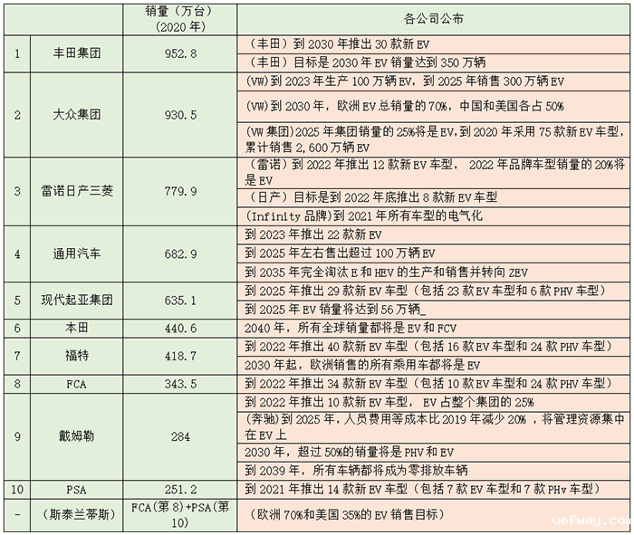 注:排名第10的Stellantis是2020年FCA和PSA的合资企业。 EV公告是Stellatis的目标值。