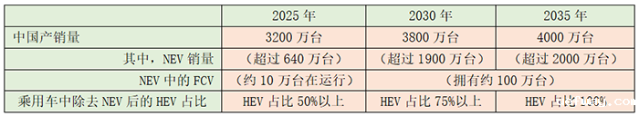 中国在2020年公布了《节能与新能源汽车路线图2.0》,目标是到2030年将NEV(新能源汽车)在所有新车中的比例提高到50%。预计2030年产销量将扩大至3800万台,2035年将扩大至4千万台。如果其中一半以上是新能源汽车,那么超过1900万辆将是PHV或更高级别的电动汽车。中国的新能源汽车是包含PHV、EV和FCV,HEV定位为节能汽车。(表3)。