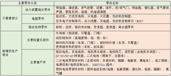 电动汽车和机动性所需的零部件及材料自然会比发动机零部件增加。还应考虑到,将使用许多具有化学产品特性的零件和材料,例如电池。表6是一个例子,预计这些新安装部件的生产需要新的设备和机械。