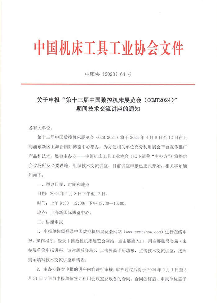第十三届中国数控机床展览会(CCMT2024)将于2024年4月8-12日在上海浦东新区上海新国际博览中心举办,为方便相关单位充分利用展会平台宣传推广产品和技术,展会主办方——luck18网址(以下简称“主办方”)将提供会议场所及必要设施,组织技术交流讲座。