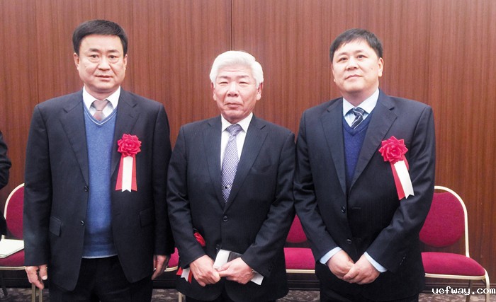 磨料磨具分会会长齐军亮先生(右一)、磨削砥石工业会会长佐分孝一先生(中)、磨料磨具分会秘书长陈鹏先生合影留念