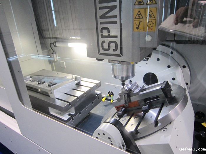 SPINNER展出两台加工中心,其中SPINNERU1530外形结构设计紧凑,其独特设计在于机床床身右侧带有大型旋转-倾翻工作台,左侧配置固定工作台,X轴长行程达1530mm,可以实现5轴联动加工,可以通过扭矩电机直接驱动旋转轴,配置机械手可完全胜任大批量生产。