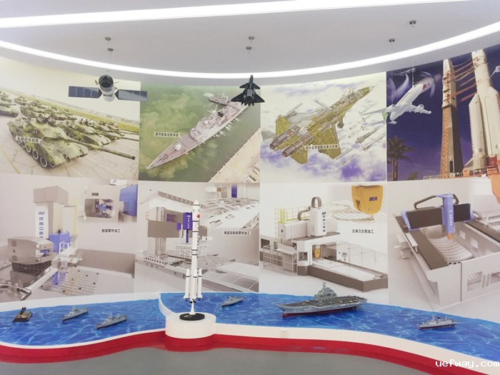 现场展示的数控机床产品,包括11台高速五轴龙门加工中心,6台三轴高速龙门加工中心,1台重型数控动梁龙门镗铣床,1套移动式6轴机械手重型刀库。其中,高速五轴龙门加工中心,有高架桥式和龙门移动式两大系列,用户为航空、航天、高铁、云轨等行业,产品的技术性能和质量接近或达到国际先进水平。