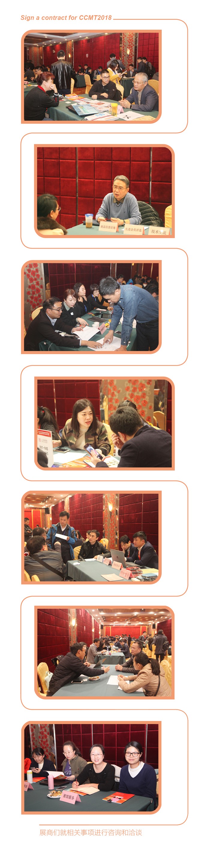 11月21-23日,CCMT2018境内展区展览预备会在无锡召开,展位面积在27平方米以上的境内展商受邀参会。21日上午全体大会之后开启了签约、咨询工作,至23日上午,境内展区参会展商签约非常踊跃,同时有众多展商针对搭建、运输、配套活动和宣传、广告、展品填报等事项进行了深入咨询和沟通,会议达到预期效果。