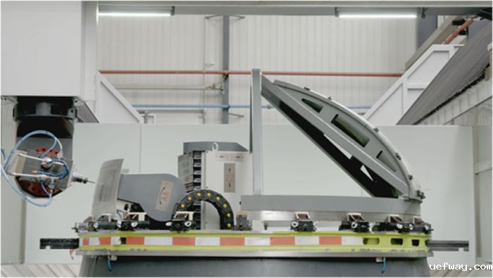 龙门加工中心配五轴双摆角铣头,对称配置四轴镜像运动支撑机构,与刀具同轨迹运行,支撑机构上有激光扫描测量装置,实时测量实现曲面重构,具备程序自动补偿功能,实现五轴柔性加工。箱底柔性装卡和自动上下料,阻尼多点支撑减震加工,水侵式超声波非接触测量。主轴转速20000r/min;主轴功率24kW。